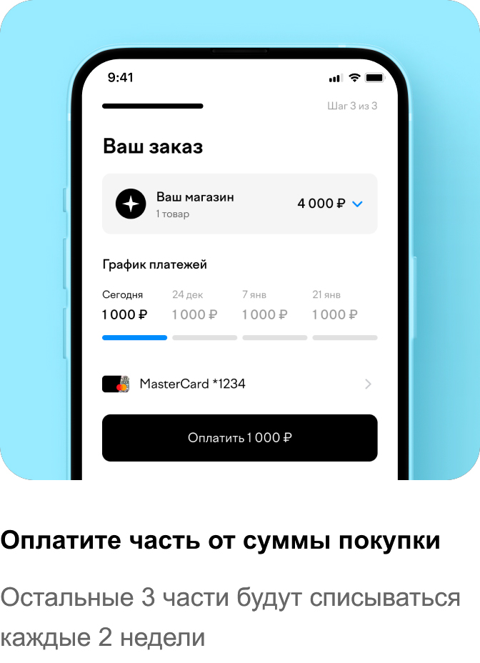 Вы заплатите всю сумму покупки в течение 6 недель. Будет 4 платежа — первый сразу, в момент покупки; остальные три части каждые две недели, пока не выплатите всю сумму.