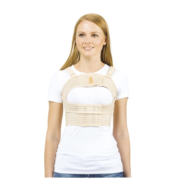 Торакальный ортез с разъемной эластичной основой сложной анатомической формы, адаптированной под женский тип грудной клетки. Разработан по технологии AirPlus: основа изделия изготовлена из эластичного материала разреженной вязки, застежка «Велкро» имеет дискретную конструкцию, гибкие планшетки в боковой части основы и в креплениях предотвращают скручивание. Боковые части основы имеют по три панели (две нижние и одну верхнюю). Дополнительная фиксация ортеза осуществляется с помощью эластичных регулируемых лямок с застежкой «Велкро», длина лямок регулируется за счет изменения уровня фиксации застежки. Высота в центральной части основы 16 см. Позволяет зафиксировать грудную клетку при множественных повреждениях благодаря сложной форме основы;