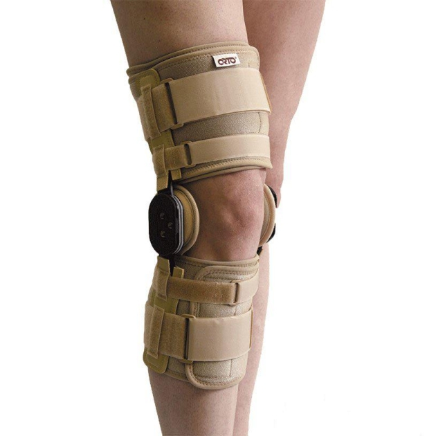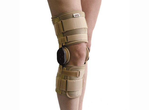 Ортез (брейс) с основами на бедро и голень, жесткими шарнирными ребрами жесткости и секторными замками.